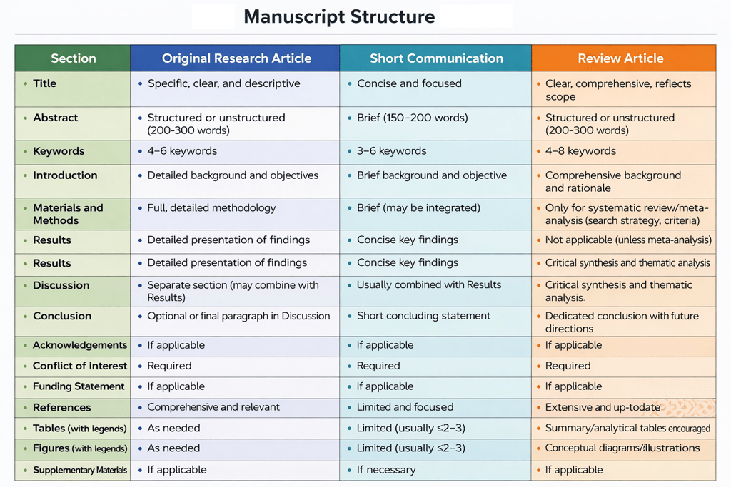 Manuscripts must be prepared on A4 paper with 1.5 line spacing throughout. Margins should be 2.54 cm (1 inch) on all sides, and pages must be numbered consecutively at the bottom. The text should be written in Arial font, size 12. The structure of the original research paper, short communication, and review paper should be organized in the following order: